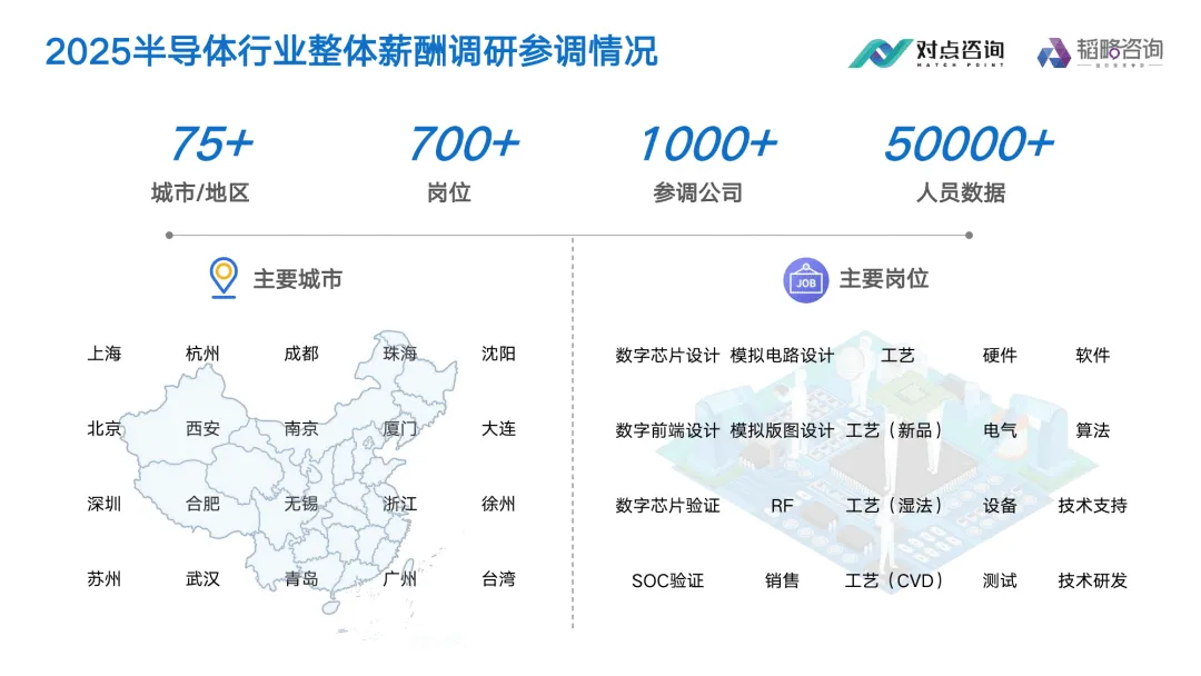 报告由对点咨询与韬略咨询联合发布,基于 75 + 城市、700 + 参调公司、1000 + 岗位及 50000 + 人员数据,全面剖析半导体行业发展趋势、薪酬管理动态及各岗位薪酬水平。