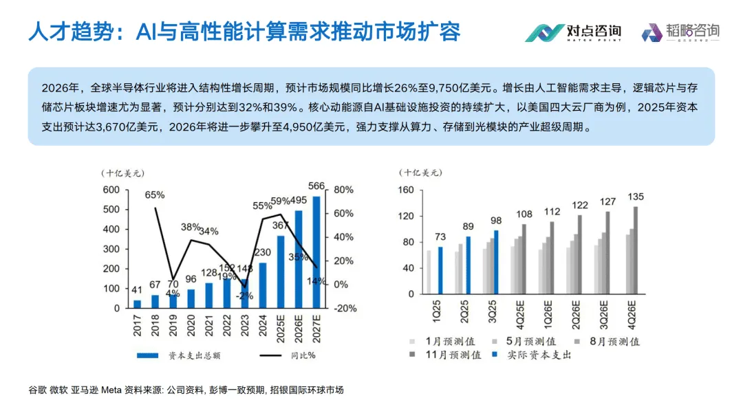 行业层面,2026 年全球半导体行业将进入结构性增长周期,市场规模预计同比增长 26% 至 9750 亿美元,AI 与自主可控成为核心驱动力。AI 芯片需求爆发,英伟达占据主导地位,国内厂商加速国产化替代;先进制程与产能本土化并行,中国晶圆代工全球占比回升至 44%;先进封装、半导体设备及关键零部件领域技术升级与国产化率提升态势显著。人才方面,呈现 “育人” 替代 “抢人”、“软硬” 技能结合、区域集群效应深化等趋势,并购活动催生细分领域核心人才流动机会。