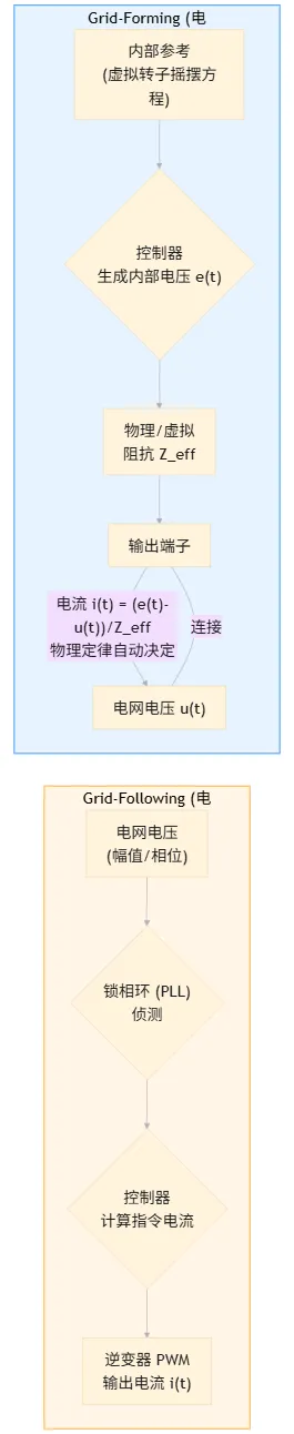 这张图清晰地揭示了两者控制哲学的根本不同。GFL是“输入驱动”,而GFM是“状态驱动”。在GFM模型中,输出电流是内部状态(虚拟电压)和外部状态(电网电压)相互作用的自然结果,而不是一个被精确计算出的指令。这种行为模式,更接近真实的物理世界,也因此更加可靠。