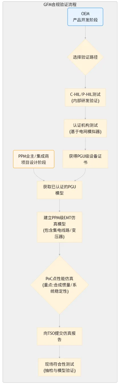 这种分裂给合规工作带来了巨大的复杂性。PPM的业主需要确保两件事:,他采购的每一台逆-变器都通过了PGU级别的电压源行为测试(通常由OEM提供设备证书);第二,他需要通过系统级的仿真来证明,这些PGU组合起来,再加上可能存在的集中式BESS,能够在PoC点上满足总的合成惯量要求。