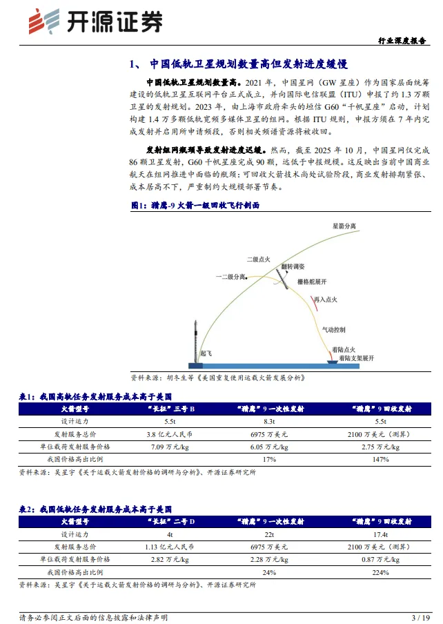 中国低轨卫星规划数量庞大,但发射进度相对缓慢。2021年,中国星网(GW星座)正式成立,向国际电信联盟(ITU)申报了约1.3万颗卫星的发射规划。2023年,垣信G60“千帆星座”启动,计划构建1.4万多颗低轨宽频多媒体卫星的组网。然而,截至2025年10月,中国星网仅完成86颗卫星发射,G60千帆星座完成90颗,远低于申报规模。这反映出当前中国商业航天在组网推进中面临的瓶颈:可回收火箭技术尚处试验阶段,商业发射排期紧张、成本居高不下,严重制约了大规模部署的节奏。