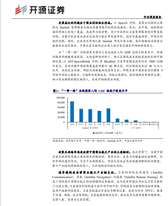 更深层次的问题在于商业闭环尚未形成。以SpaceX为例,其商业化路径主要依托Starlink宽带服务及面向存量智能手机的直连通信。然而,在中国,地面移动通信网络已实现广覆盖、高速率与低资费,用户对高价位卫星宽带服务的付费意愿有限。同时,全球发达市场已被Starlink等先行者占据,叠加地缘政治因素与数据安全监管要求,中国卫星互联网企业进入西方发达国家市场的难度较大。而“一带一路”沿线国家及国内欠发达地区人均GDP远低于欧美水平,目标客群相对较少,难以支撑高成本低轨星座的长期可持续运营。