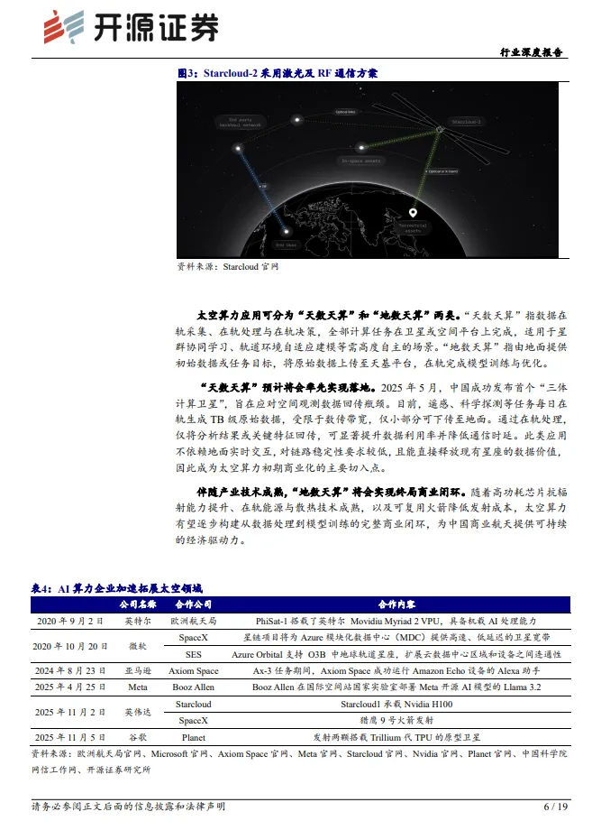 太空算力的应用场景主要分为“天数天算”和“地数天算”两类。“天数天算”指数据在轨采集、在轨处理与在轨决策,全部计算任务在卫星或空间平台上完成,适用于星群协同学习、轨道环境自适应建模等需高度自主的场景。例如,2025年5月,中国成功发布首个“三体计算卫星”,旨在应对空间观测数据回传瓶颈。通过在轨处理,仅将分析结果或关键特征回传,可显著提升数据利用率并降低通信时延。而“地数天算”则指由地面提供初始数据或任务目标,将原始数据上传至天基平台,在轨完成模型训练与优化。随着高功耗芯片抗辐射能力的提升、在轨能源与散热技术的成熟,以及可复用火箭降低发射成本,太空算力有望逐步构建从数据处理到模型训练的完整商业闭环,为中国商业航天提供可持续的经济驱动力。