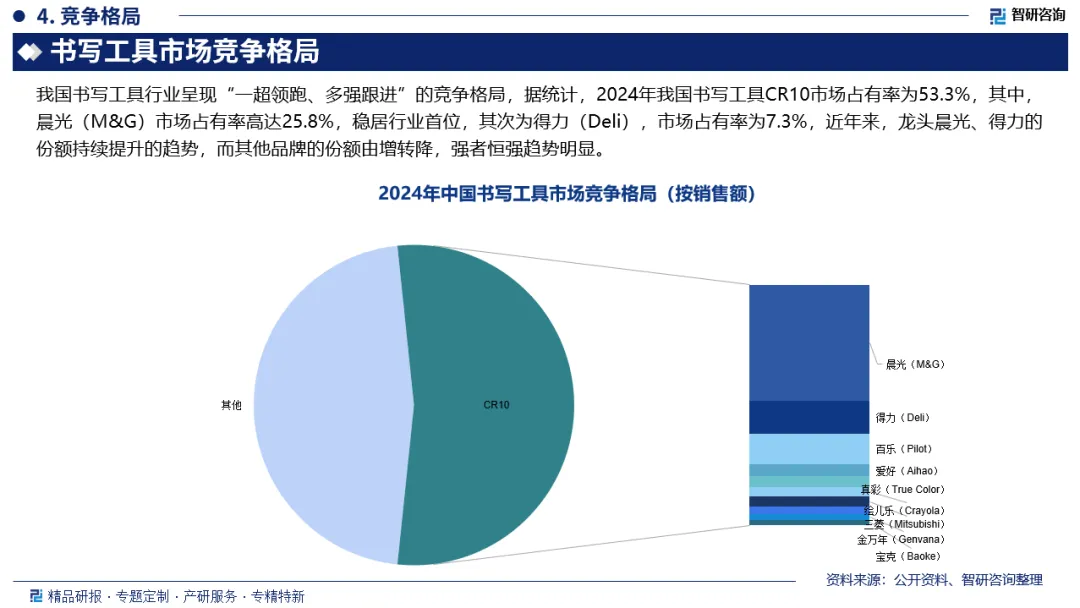 市场竞争格局:我国书写工具行业呈现“一超领跑、多强跟进”的竞争格局,据统计,2024年我国书写工具CR10市场占有率为53.3%,其中,晨光(M&G)市场占有率高达25.8%,稳居行业首位,其次为得力(Deli),市场占有率为7.3%,近年来,龙头晨光、得力的份额持续提升的趋势,而其他品牌的份额由增转降,强者恒强趋势明显。