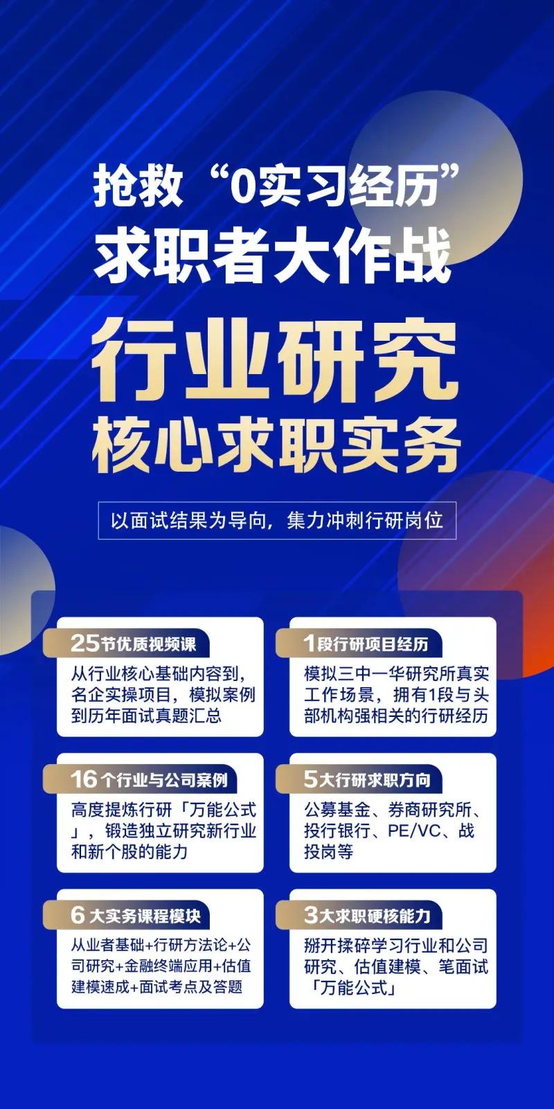 系统性地从最前沿的方法指引如何成为一个卓越的分析师和行业研究员,从商业研究分析思路与框架到案例分析,给你全方位的行研培训、券商专业的笔试和面试培训,为大家深入浅出地讲解行业研究相关知识点,使你稳坐职场先锋!