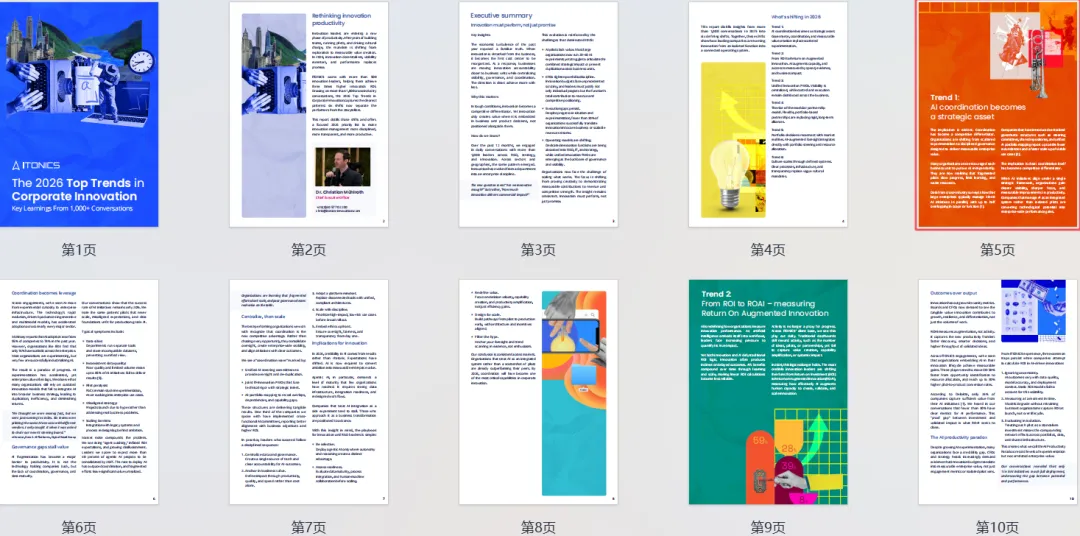 全球创新管理领导者 ITONICS 基于与 500 + 创新领袖的深度合作,以及 1000 + 跨行业对话的核心洞察,发布《2026 年企业创新顶尖趋势报告》,直指核心命题:创新必须从 “承诺” 走向 “绩效”,从分散的 “点式努力” 升级为互联的 “系统能力”。报告提炼的六大关键转向,不仅揭示了 2026 年创新的竞争焦点,更构建了一套可落地的企业创新操作系统(Innovation OS)。