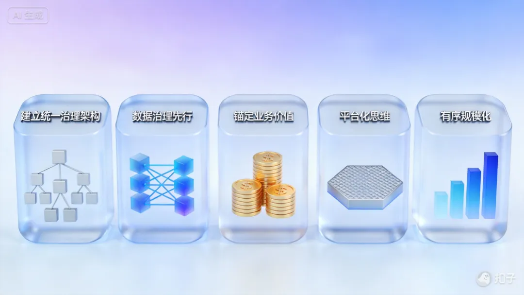建立统一治理架构:设立 AI 指导委员会、共享知识库和统一 AI 组合映射,减少冗余(实施后企业报告冗余减少 60%); 数据治理先行:打破数据孤岛,建立单一数据源,确保数据质量与合规性; 锚定业务价值:以生产力、质量、速度为核心指标,而非单纯追求 “技术先进”; 平台化思维:用统一合规的架构替代零散工具,为规模化奠定基础; 有序规模化:优先推广高影响、低风险的用例,而非盲目扩张。