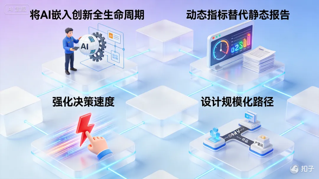 将 AI 嵌入创新全生命周期:前瞻阶段用 AI 扫描弱信号,构思阶段用生成式 AI 辅助场景建模,组合管理阶段用预测分析评估项目平衡; 动态指标替代静态报告:通过实时仪表盘跟踪创新进度与学习速度,而非依赖年度 ROI 报告; 强化决策速度:利用 AI 助手持续输出洞察,支持资源动态重分配; 设计规模化路径:从试点阶段就搭建数据管道、治理架构,确保平滑过渡到量产。