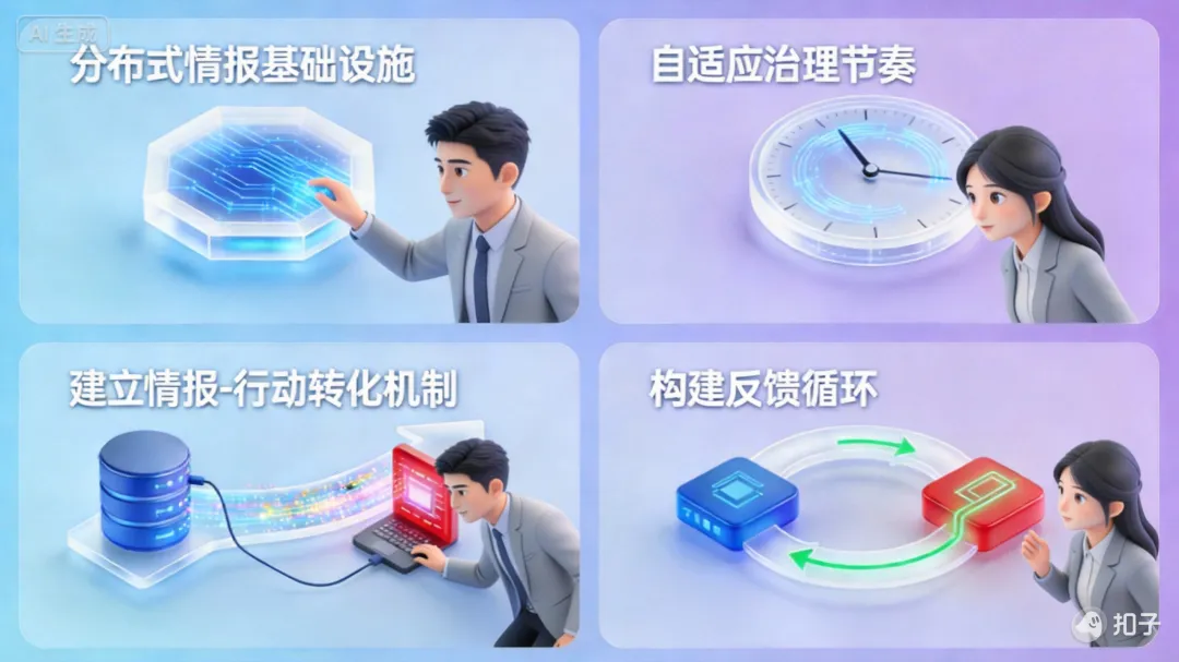 分布式情报基础设施:为组合经理、研发负责人配备 AI 增强型扫描工具,将竞争动态、监管草案、技术信号直接嵌入创新仪表盘; 自适应治理节奏:用 “月度组合校准会” 替代年度战略评审,将市场情报与项目绩效数据结合,动态调整投资; 建立情报 - 行动转化机制:将扫描结果与 ROI、风险敞口、能力对齐等业务指标挂钩,避免数据过载; 构建反馈循环:跟踪前瞻驱动决策的效果,持续优化扫描优先级。