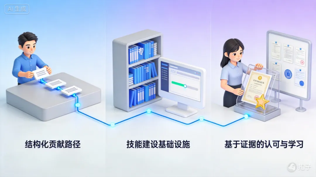 结构化贡献路径:明确创意提交、项目加入、工具获取的入口,建立决策反馈机制(即使拒绝也要说明原因,将拒绝转化为学习); 技能建设基础设施:将创新技能(实验设计、设计思维、系统思维)融入企业学习平台,推行微认证体系,建立跨职能创新社区; 基于证据的认可与学习:用透明指标衡量个人 / 团队的创新贡献(而非 “知名度”),建立可搜索、可复用的实验知识库,避免重复劳动。