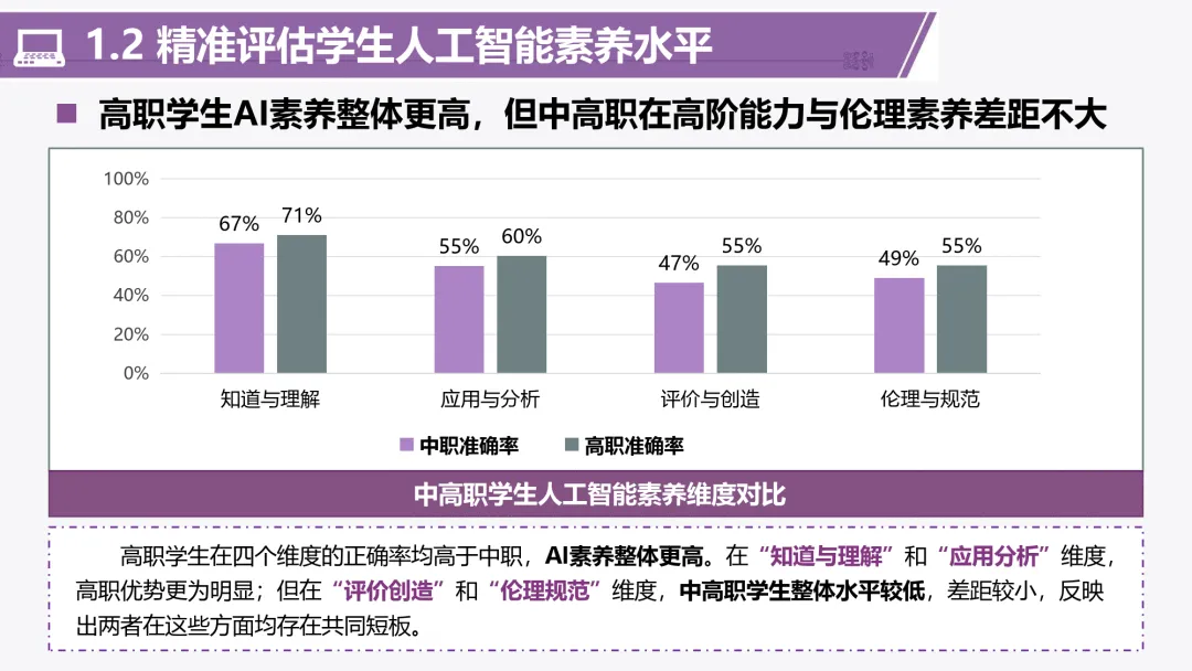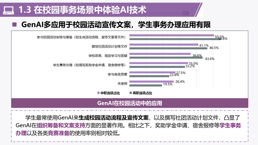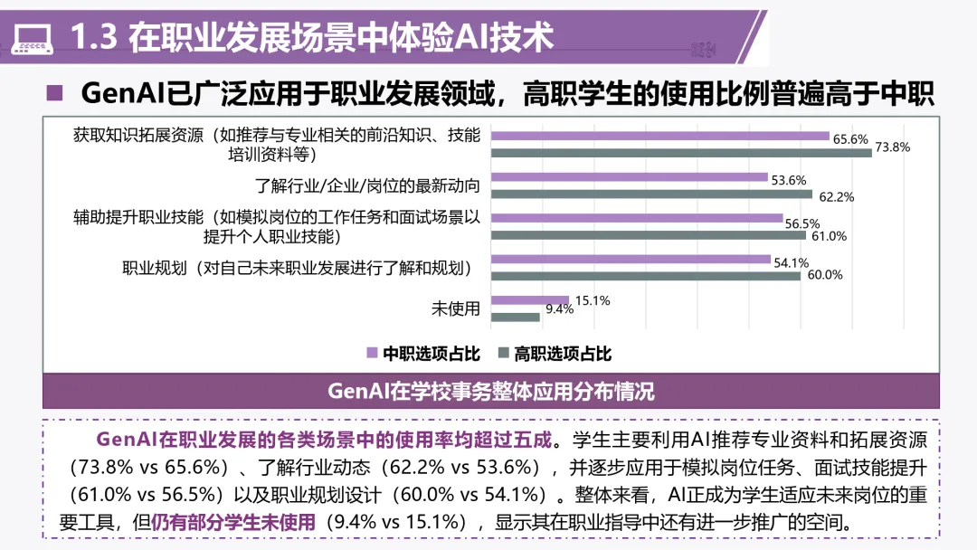 报告核心围绕师生智能素养发展、AI 创新人才培养、产教深度融合、智慧校园升级、伦理安全保障等八大板块展开。师生层面,学生广泛使用 GenAI 进行知识拓展、职业规划等,高职学生使用率高于中职,但双方在创新能力与伦理意识上均有短板;教师智能教学素养整体达标,高职优于中职,东部地区领先西部,但高阶应用能力不足。