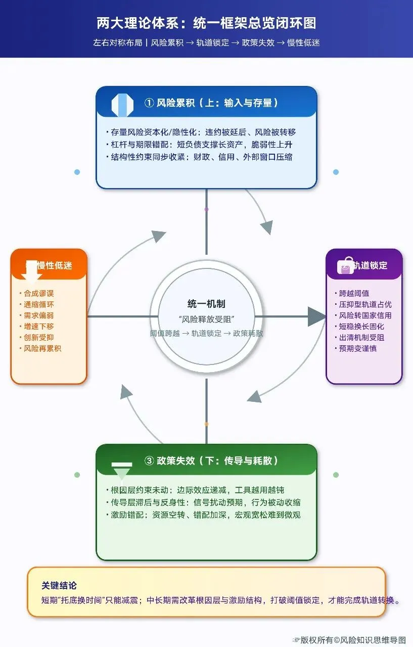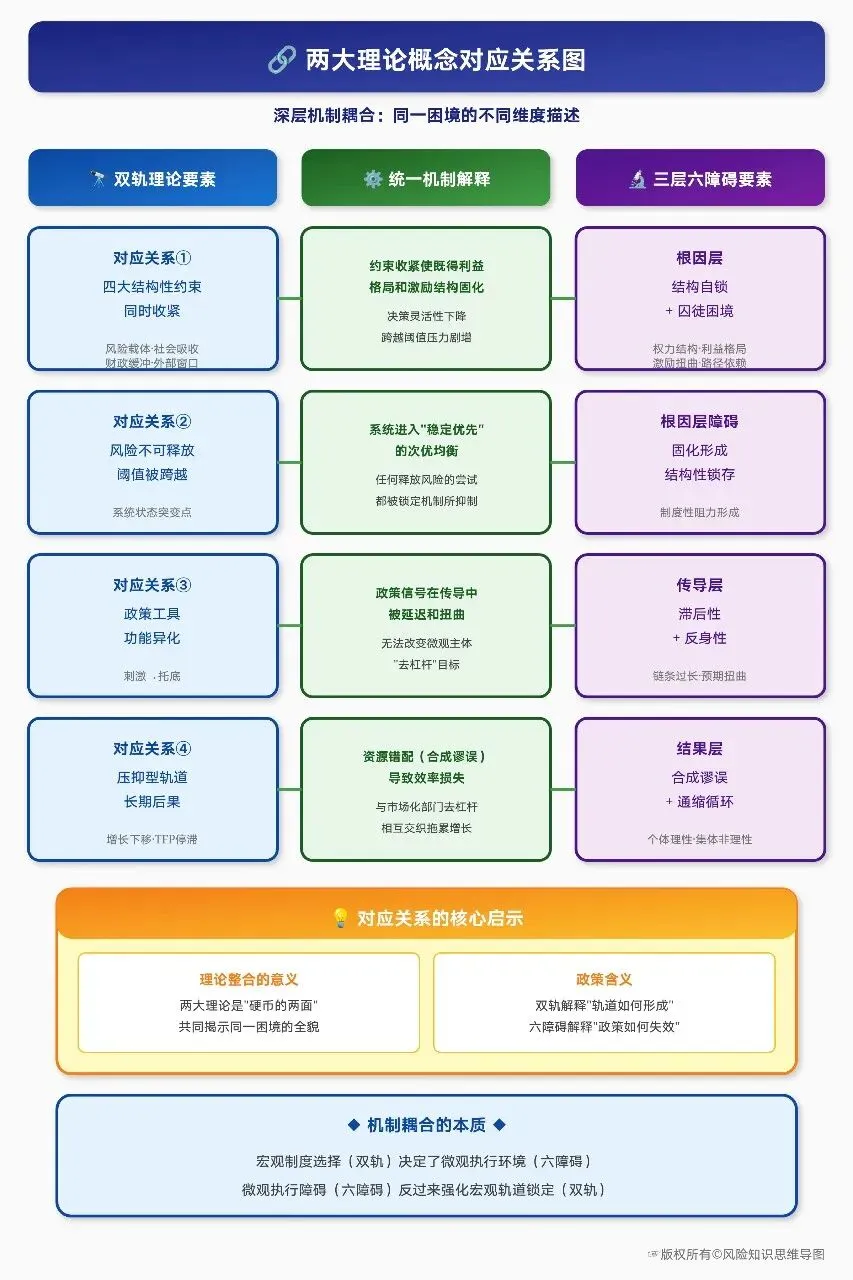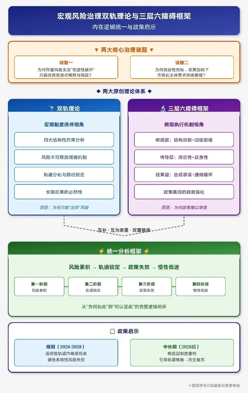 双轨理论与三层六障碍框架并非两套平行的解释体系,而是从宏观与微观、结构与行为两个互补视角,对同一系统困境的深度描述。它们如同一枚硬币的两面,或是一对精巧的“双重镜像”,彼此映照,共同揭示了全貌。将它们有机整合,可以构建一个逻辑严密、层层递进的统一分析框架:“风险累积—轨道锁定—政策失效—慢性低迷”。