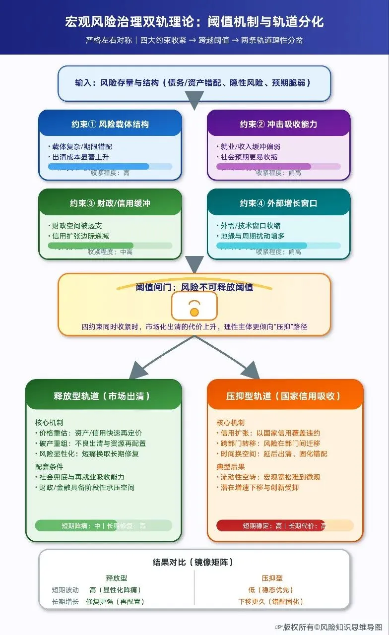 为了系统性地回答上述谜题,超越表象,直击本质,引入并整合两大原创理论体系显得尤为必要且迫切。“宏观风险治理的双轨理论” 如同一架高倍望远镜,从宏观历史与政治经济学的宏大视角,揭示了风险治理路径分化的必然性与轨道锁定的“阈值”机制。其核心洞见在于,在特定的四大结构性约束(风险载体结构、社会冲击吸收能力、财政国家信用缓冲、外部增长窗口)的共同作用下,任何一个经济体都将不可避免地收敛于两种稳定的制度均衡之一:“风险释放型轨道”或“风险压抑型轨道”。当这四大约束如同四条收紧的绳索,同时勒紧并跨越了某个“风险不可释放阈值”时,压抑型轨道便从众多选项之一,演变为制度理性主体在权衡利弊后的唯一理性占优策略。这从根本上、从宏观制度选择的层面回答了为何存量风险只能被“压抑”而非“释放”的第一个谜题。