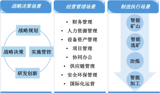 有色金属行业的数智化转型是一项系统工程,需要核心技术平台作为底层支撑,同时也需实现价值创造的应用场景。技术平台为各类智能化应用提供计算能力、数据资源和通用服务,而应用场景则将技术能力精准对焦于业务痛点,转化为实实在在的运营效益和竞争优势。这些场景贯穿于企业战略决策、运营管理和生产制造的全价值链,是技术平台与业务需求深度融合的产物。它们不仅解决了行业长期存在的痛点,如生产效率不高、安全环保压力大、产业链协同弱等,更开创了全新的运营模式和增长路径。