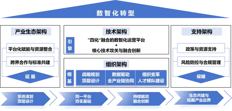 并循序落实“四个推进步骤”,第一,系统谋划顶层设计:从战略高度明确转型目标与实施路径,统筹规划、科学布局,确保转型的系统性与前瞻性。第二,同一平台夯实基础:建设统一数字平台,打破信息孤岛,夯实数据基础与IT架构,为全面数字化提供支撑。第三,持续驱动融合创新:推动数字技术与生产工艺、经营管理深度融合,实现技术迭代、业务创新与效率提升;第四,生态共建与拓展产业边界:构建协同发展生态,探索新模式、新业态,推动产业链延伸与价值链提升。