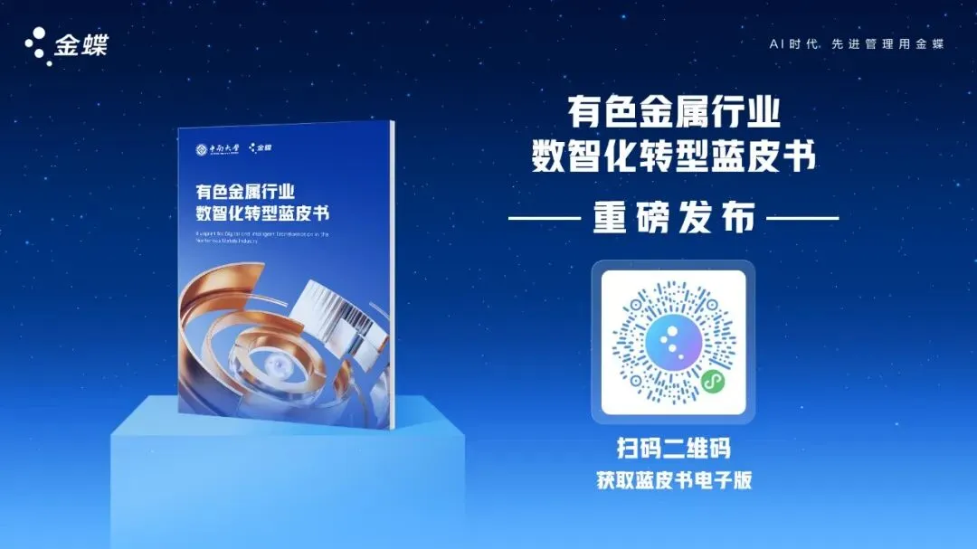 金蝶携手中南大学重磅发布《有色金属行业数智化转型蓝皮书》,探索了有色金属行业数智化转型的新思想、新技术和新方案,为行业企业在数智化升级过程中提供有力借鉴。