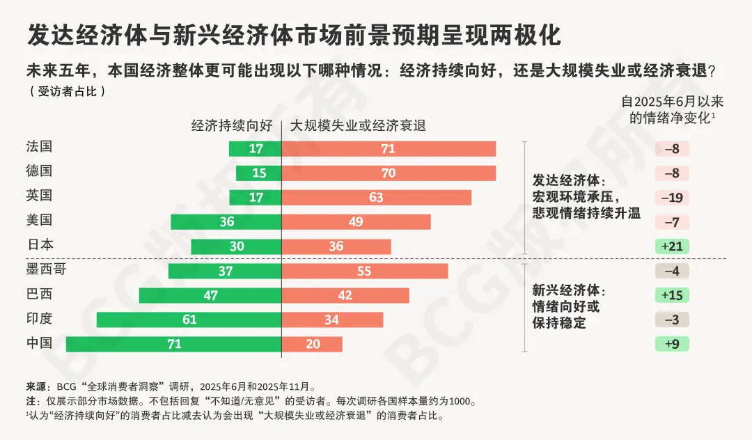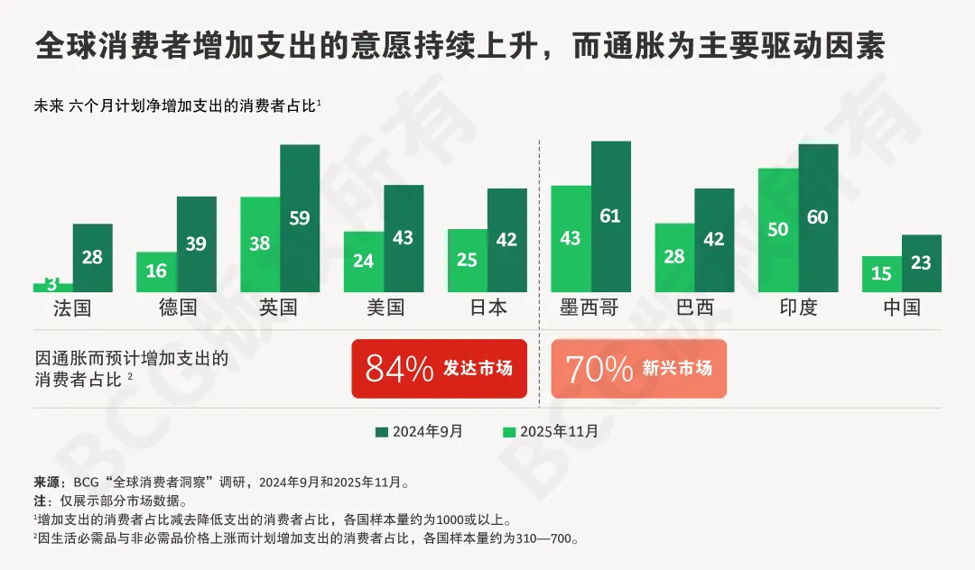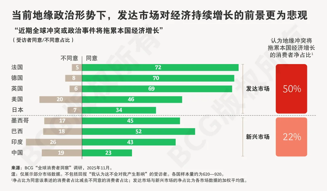 在通胀持续推高生活成本的背景下,全球消费者预计支出将上升,但这一增长并非源自消费意愿,而是“被动应对”的结果。中国消费者与全球趋势同频共振——支出决策愈发理性、消费优先级持续重排。自2025年6月以来,多数发达经济体的消费者对经济增长的信心持续走弱。对消费品与服务企业而言,持续洞察消费者情绪变化、理解压力之下的真实选择逻辑,是在谨慎消费时代寻找增长机会的关键。