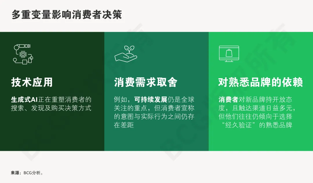 这种两极分化的市场预期,仅是企业需应对的多重挑战之一。除此之外,企业还需考量生成式AI的应用、消费需求取舍和对熟悉品牌的依赖三大维度对消费者购物决策的影响。
