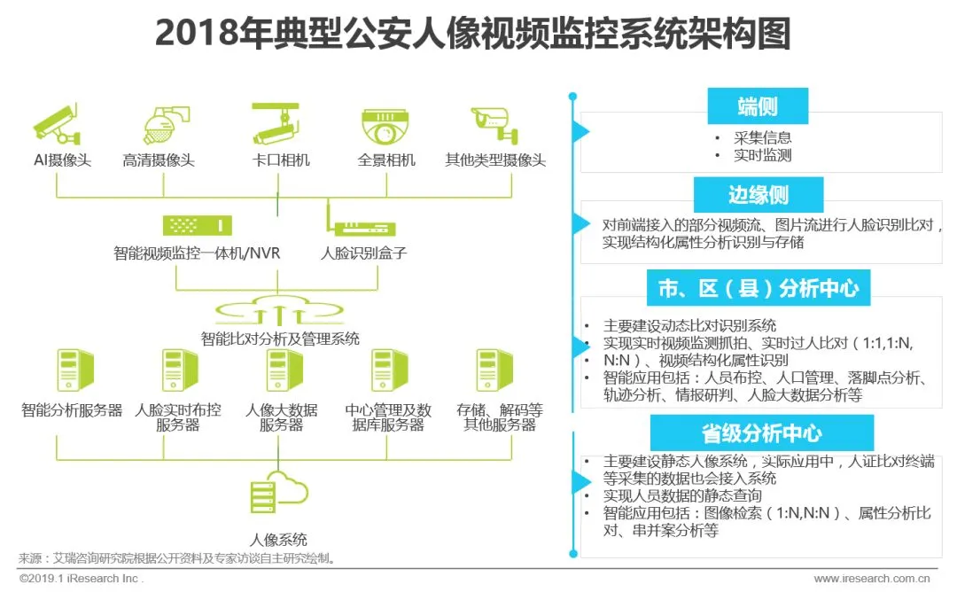 前文提及,安防人脸识别的实现大多需要新建或改造现存前端摄像机,简单来看,人脸检测、抓拍乃至比对等人脸识别算法可由AI摄像机在感知节点实现,或由高清网络摄像机配合后端服务器完成。2018年市场较为理性,从铺设速度看,AI摄像机在公安动态识别系统项目中渗透约达到16.6%,而若考虑全国近2300万路现存公安监控摄像头,则渗透率约0.4%,从设备能力看,符合应用场景可用指标为核心准则。