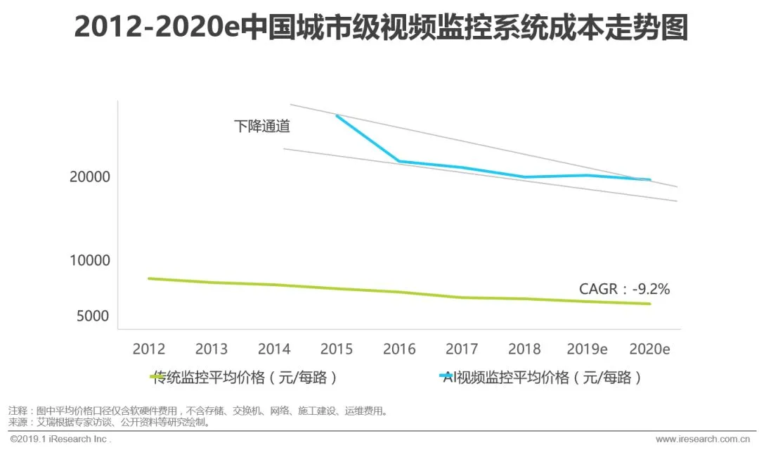 在国产化的作用下,传统监控(包括模拟摄像机、高清摄像机等)的平均价格下降,2012年至2018年CAGR为-9.2%,而AI视频监控(包括前端智能、后端智能等)应用大部分出现于2015年,其价格走势也进入了下降通道,到2018年平均价格约为2万元一路,近几年将保持平稳下降态势。
