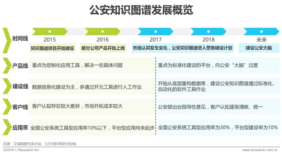 公安知识图谱建设起步较晚,2015年有少部分大数据分析公司开始尝试建设,初期以小而具体的工具软件形式出现,数据关联更多是通过人工打标签实现,效率低且价值有限,在全国范围的应用率仅为10%以下。经过技术发展和落地实践,以及企业内部技术标准统一和服务工具自动化迭代,自2017年开始市场认知产生变化,随着2018年公安部出台相关指导意见,各级公安系统对公安知识图谱的认知逐渐清晰、统一,更多基础层平台化的大型项目开始投入建设,已有项目维护和应用持续进行,2018年工具型公安知识图谱应用率为30%,平台型建设率达到10%,艾瑞将持续看好其发展。