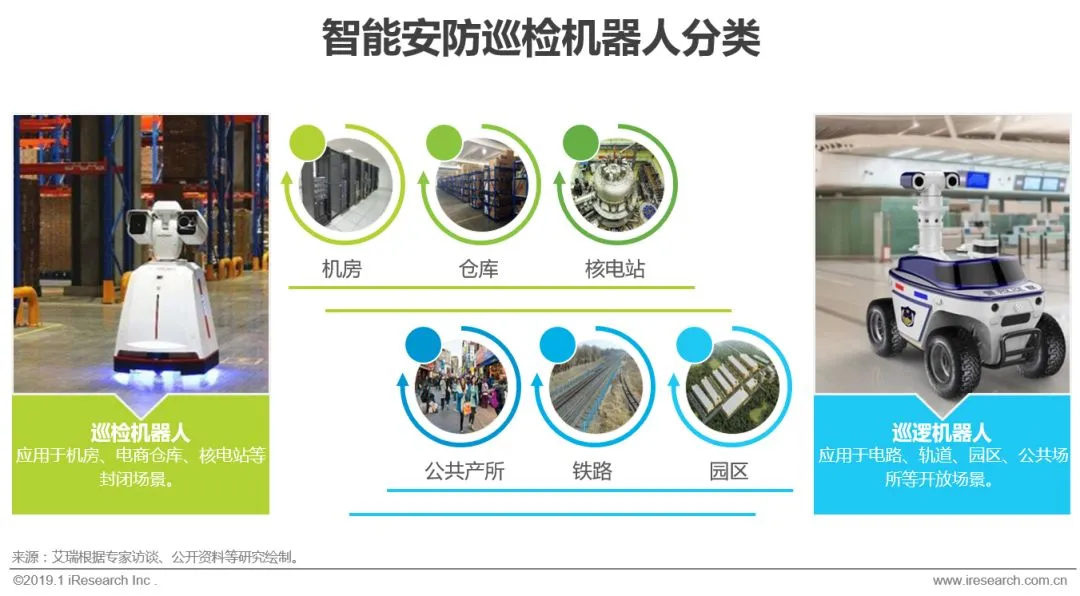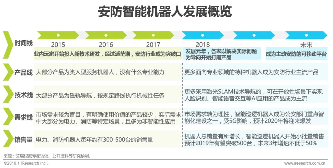 继2005年国内第一台电力巡检机器人投入使用之后,机房巡检机器人、消防机器人等产品开始陆续出现在市场中。2015年是一个发展节点,业内一众玩家捕捉到赛道的潜力,开始致力于人工智能、物联网、导航技术等新兴技术的研发,成长起如高新兴机器人、国自机器人、安泽机器人等一批业内优秀的企业,但当时市场需求较为盲目,多以展示型需求为主,市场空间有限,行业也一度陷入迷茫期,但随着智能机器人在安防行业的落地试用,为行业找到了突破口。2018年是安防智能机器人发展元年,北京安博会中抢眼的表现、公安部门大力规划建设和年底激增的订单量都证明了其在主动安防大背景下的价值所在。未来安防智能机器人将向可移动平台方向发展,向更多应用领域开放其后台,带来更多附加价值,艾瑞也将持续关注其发展。