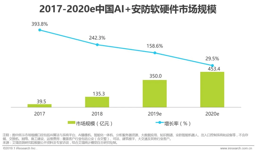 2018年,我国AI+安防软硬件市场规模达到135亿元,相较于2017年增长接近250%,部分头部安防厂商AI业务在总营收中占比从大约4%提升至超过8%,部分典型AI公司安防业务则占接近一半的营业收入。预计2019年市场仍将保持高增速,到十三五收官之年2020年增速开始稳定,届时市场规模可达到453亿元,从2017年到2020年CAGR达到125.5%。
