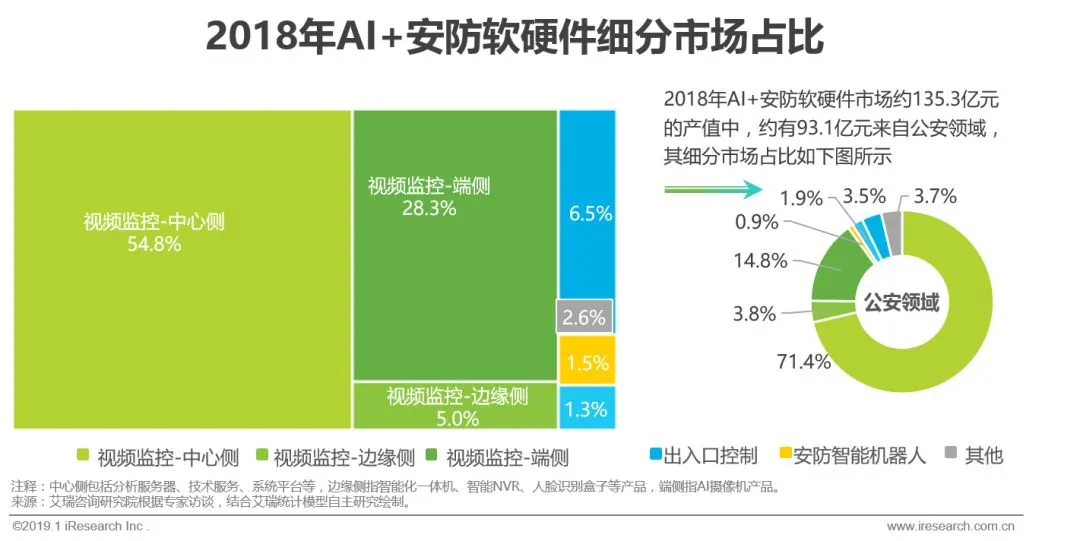 2018年AI+安防软硬件市场约135.3亿元的产值中,视频监控占据绝大部分,份额近90%,成为AI+安防的主赛道。其中,端侧市场规模超过38亿元,占28.3%,中心侧市场规模超过74亿元,占54.8%。而在AI+安防的核心战场公安领域,总市场规模约93.1亿元,其中端侧市场规模约13.8亿元,占14.8%,中心侧市场规模约66.5亿元,占71.4%,边缘侧渗透有限,占比较小,约3.8%。出入口控制的主要产品如人脸识别闸机、门禁等,门槛相对较低,与监控人脸识别具备相通之处,因此绝大部分安防产品与解决方案提供商均涉足这部分业务,其市场相对较大。值得注意的是,知识图谱与安防智能机器人业务起步时间短、份额较小,但发展潜力强,随着结构化信息池的丰富,大规模布控、社会治理场景中知识图谱将成为刚需,而机器人由于支持复杂场景的产品成熟仍需较长时间,爆发时点会相对稍晚。
