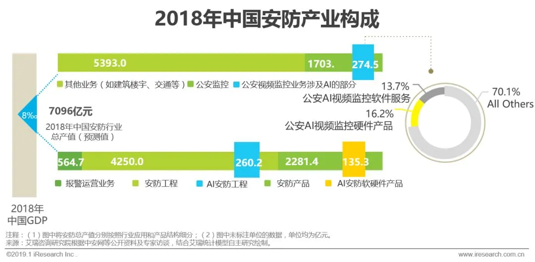 2018年中国整体安防行业产值约为7096亿元,按照行业应用来看,公安监控业务约1703亿元,其中AI软硬件及相关建设费用可达到274.5亿元(软件部分约37.7亿元,硬件部分约44.4亿元,相关配套设施与工程等部分约192.5亿元),目前试点类项目较多,软件部分受到一定程度的预算压缩,随着大规模动态识别项目的建设,这种情况可能得到改善。按照业务构成看,AI类项目收入约共计395.5亿元,其中工程部分约260.2亿元,软硬件产品部分约135.3亿元。