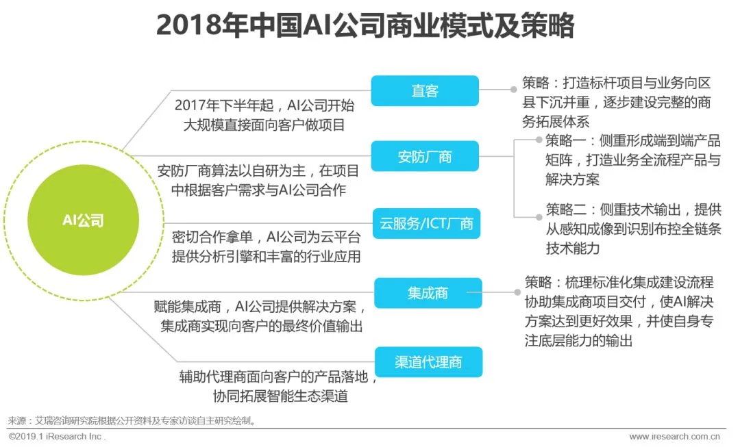 2018年AI公司直接面向客户的项目占比大幅提高,并更注重各类商业合作伙伴的拓展。在与安防厂商的合作方面,出现两类分化的策略,一种是逐渐打造自身全流程产品与解决方案业务闭环,这背后有两大动因,一是由于安防行业特性,硬件仍然具有市场入口地位,AI公司对设备和产品的重视提升,二是安防厂商在维持产业链核心地位的需求下对自研算法的投入和使用更强调,外采需求弱化;另一种是发挥技术优势,将从感知成像到识别布控全链条能力开放的技术输出策略。