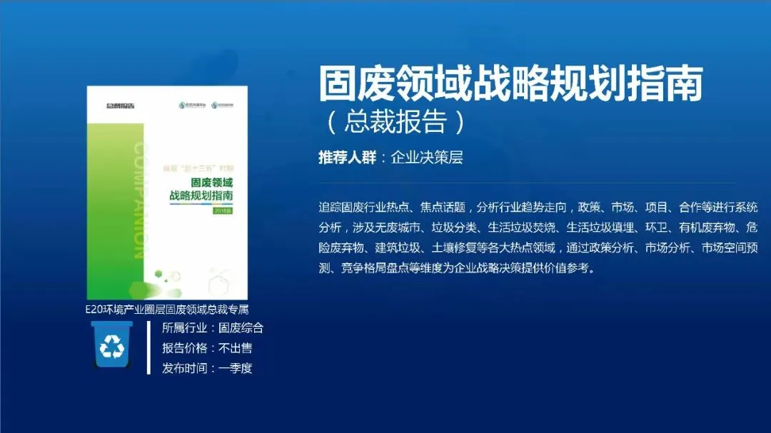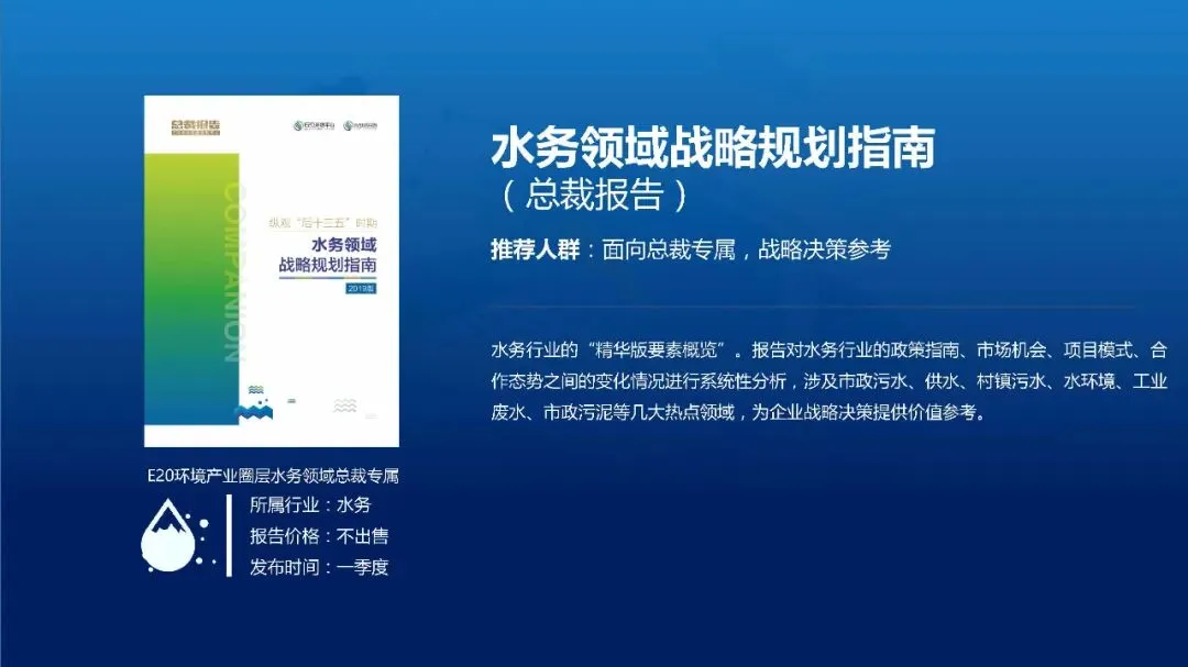 2020年,E20研究院重磅发布系列报告,近日推出:水务领域战略规划指南(总裁报告)、固废领域战略规划指南(总裁报告),对2019年行业的政策指向、市场机会、项目模式、合作态势之间的变化情况进行系统性分析,为企业战略决策提供价值参考。点击图片可查看E20研究院2020全年行业报告~
