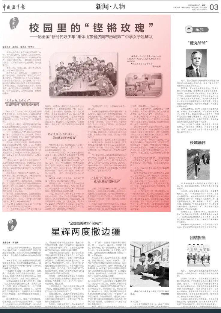 近日,《中国教育报》刊发文章《校园里的“铿锵玫瑰”——记全国“新时代好少年”集体山东省济南市历城第二中学女子足球队》,深度报道了历城二中女子足球队如何用汗水与拼搏书写青春篇章。