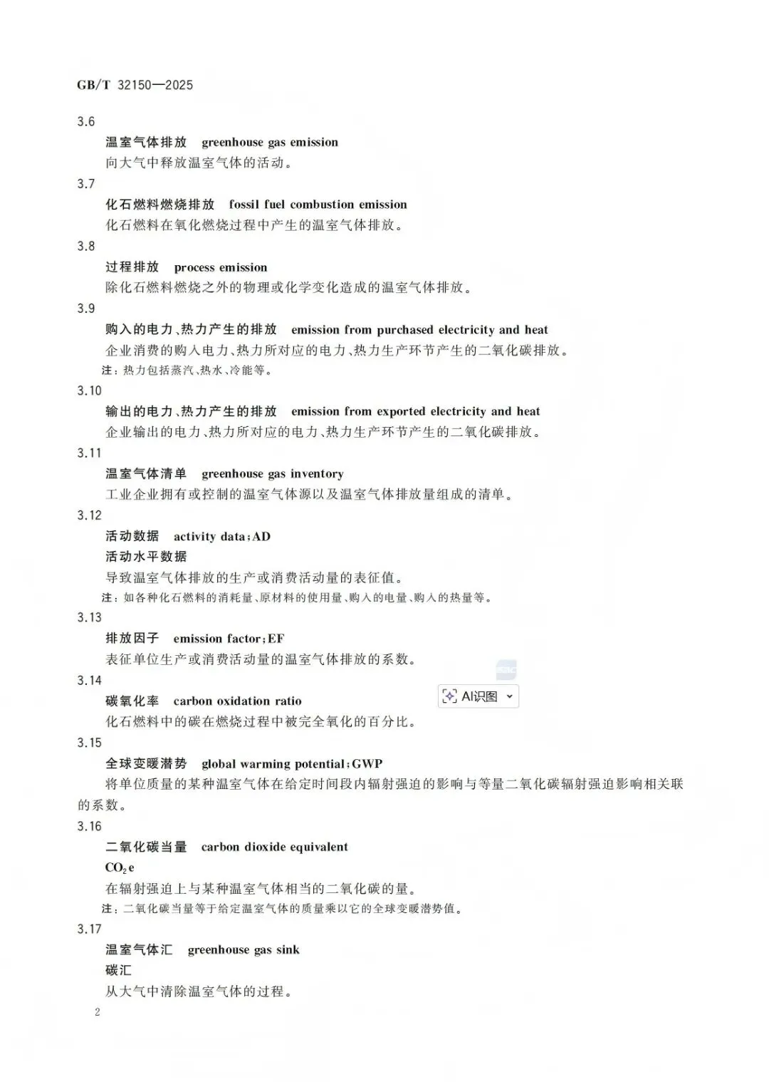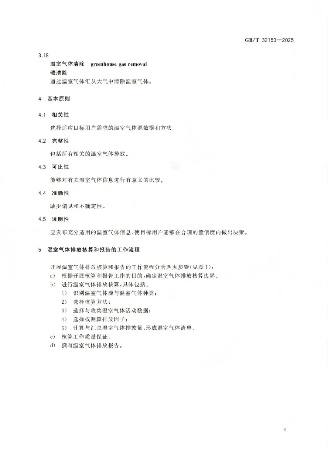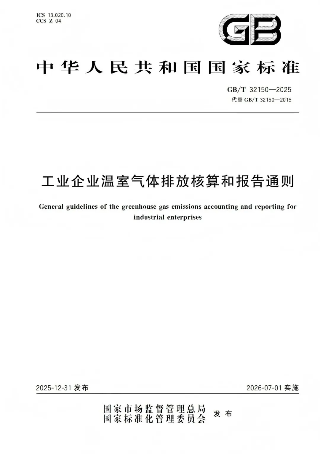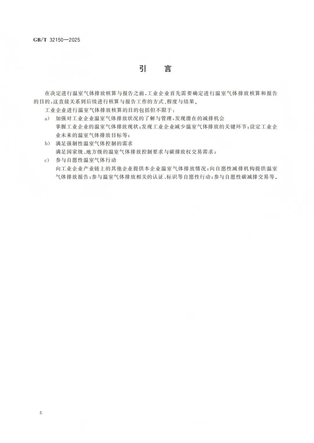 《工业企业温室气体排放核算和报告通则》规定了基本原则、工作流程、核算边界、核算步骤与方法、核算工作的质量保证、温室气体排放报告等相关内容。新标准代替 GB/T32150—2015《工业企业温室气体排放核算和报告通则》,与 GB/T32150—2015相比,除结构调整和编辑性改动外,主要技术变化如下: