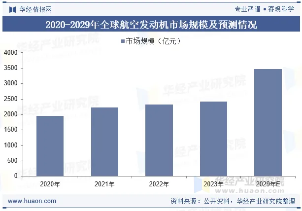 航空发动机行业的发展水平是一个国家工业基础、科技水平和综合国力的集中体现,也是国家安全和大国地位的重要战略保障。近年来全球航空发动机市场持续扩容,2023年约为2424.11亿元,同比增长4.36%。未来受益于全球航运需求不断增长、新兴市场的快速扩张以及高效环保的发动机技术创新,预计2029年将增长至3478亿元,2023-2029年期间复合年增长率为6.2%。
