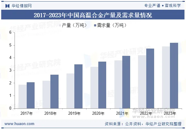 高温合金是航空发动机领域的核心战略资源,也是决定航空发动机性能的重要瓶颈。高温合金作为一种能在600°C以上及一定应力条件下长期工作的金属材料,很好地满足了现代航空发动机对材料的苛刻要求,因此成为航空发动机热端部件不可替代的关键材料。近年来我国高温合金产量及需求量逐年增长,2023年中国高温合金产量约4.9万吨,需求量约5.2万吨。