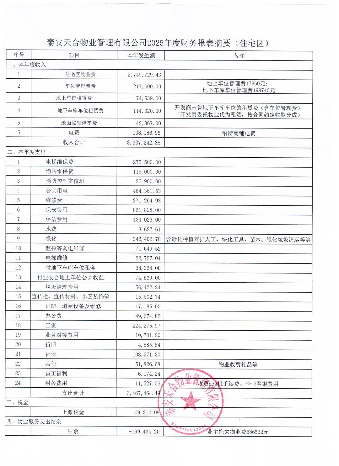 泰安天合物业公司2025年度财务报告摘要、业主委员会公共收益提取与支出、外来车辆临时停车计时收费公示