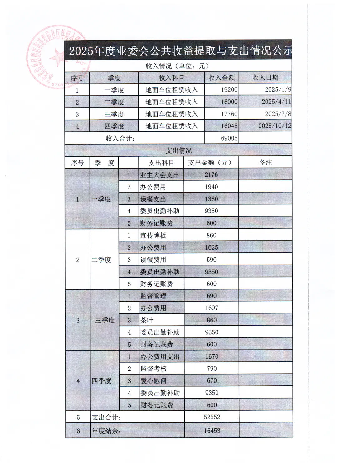 业主委员会2025年度公共收益提取与支出