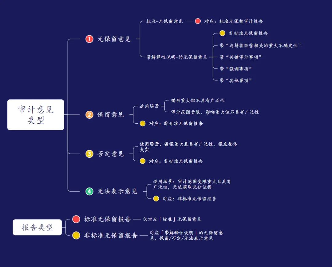 审计报告按 意见类型 被分为四大类,分别是 无保留意见审计报告(其中又包括标准无保留意见和带解释性说明的无保留意见)、保留意见审计报告、否定意见审计报告、无法表示意见审计报告。如下图:
