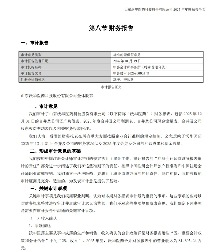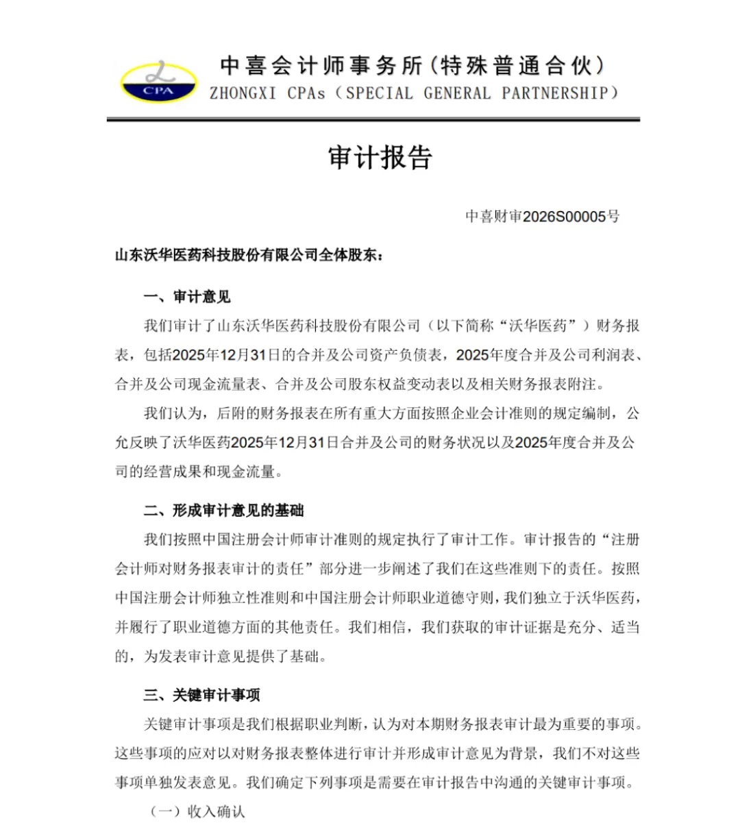 如下图:中喜为深交所主板上市公司沃华医药(002107.SZ)财务报告出具了标准无保留意见的审计报告。公司同时发布公告,拟续聘中喜为公司2026年度审计机构。