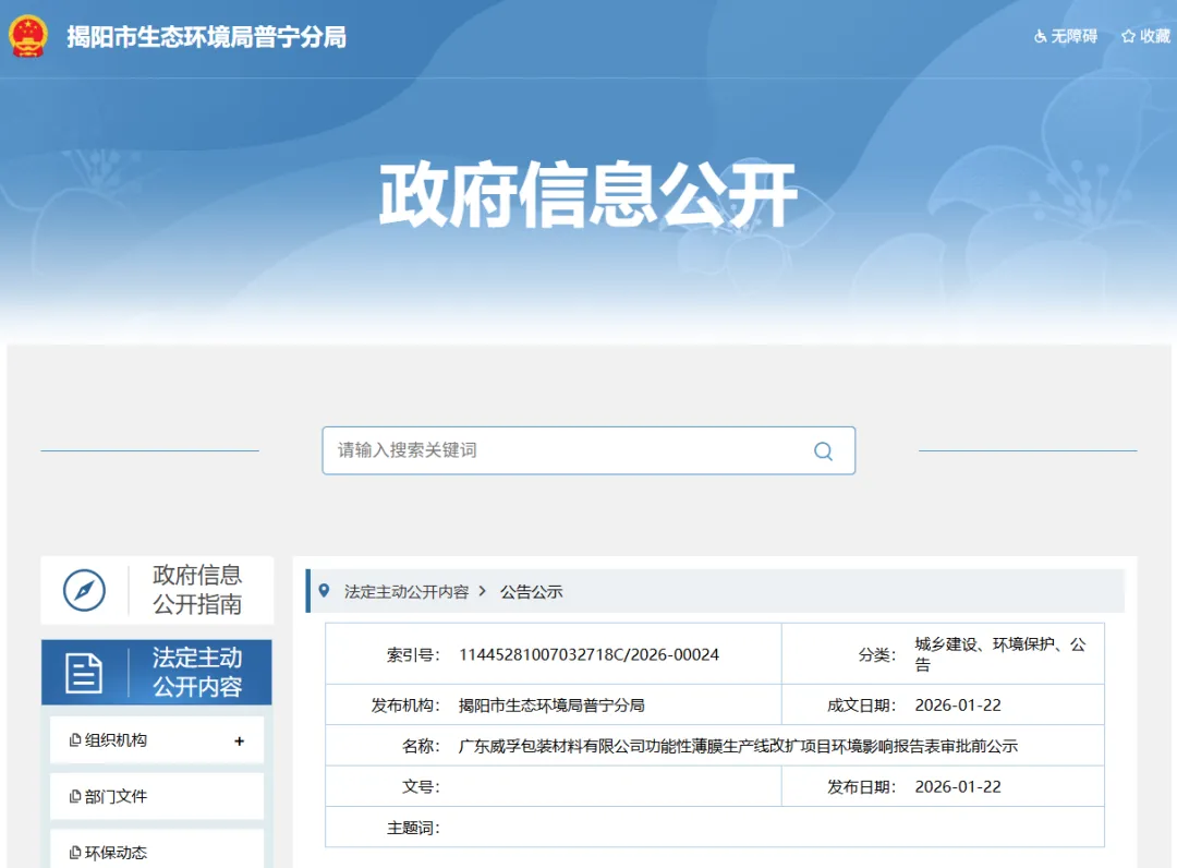 广东威孚包装材料有限公司功能性薄膜生产线改扩项目环境影响报告表审批前公示