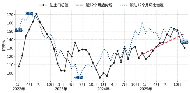 2025年1-12月,阿根廷进出口累计1628.7亿美元,同比(较上年)增长15.9%,其中12月当月进出口130.0亿美元,同比增长4.8%,环比(较上月)下降5.3%,近12个月趋势向上。