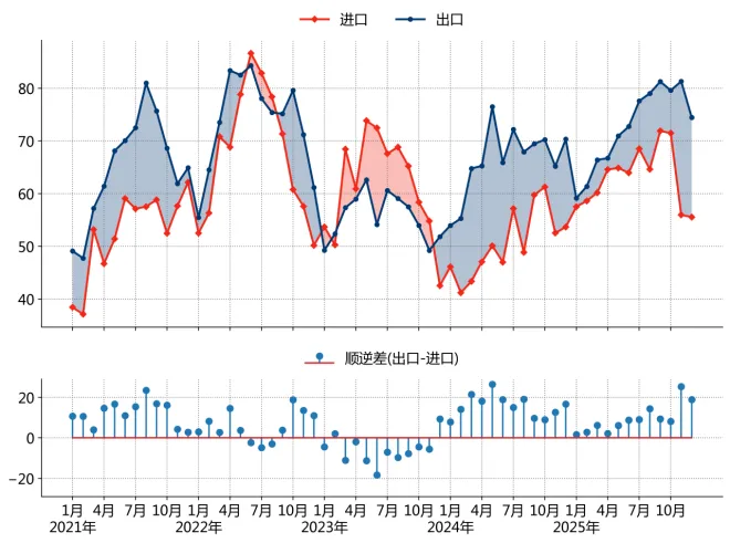 图 1_42021-2025年12月阿根廷进口、出口及顺逆差走势图(亿美元) 数据来源:阿根廷国家统计与普查研究所, 瀚闻资讯