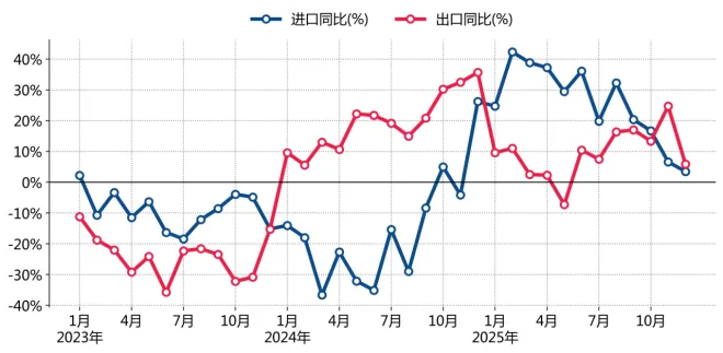 图 1_52023-2025年12月阿根廷进口、出口当月同比增速走势图(%) 数据来源:阿根廷国家统计与普查研究所, 瀚闻资讯
