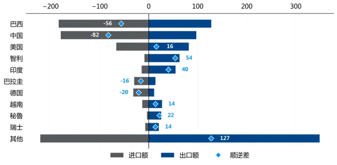 按顺逆差统计(出口额减进口额),2025年1-12月,阿根廷贸易顺差为112.9亿美元,具体来看,阿根廷对中国贸易出现82.3亿美元逆差,对智利实现54.1亿美元顺差。