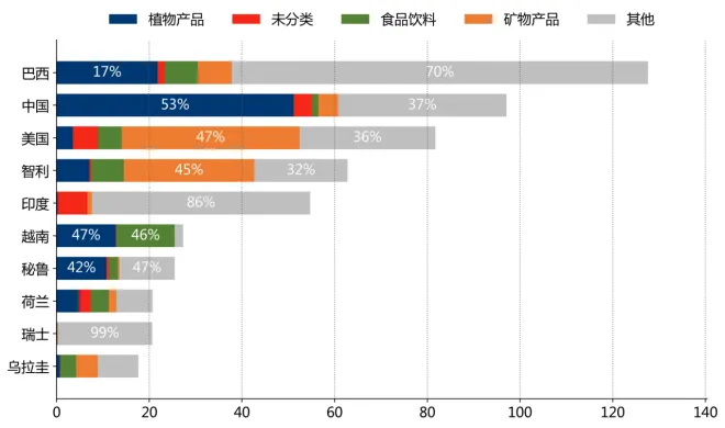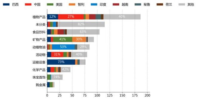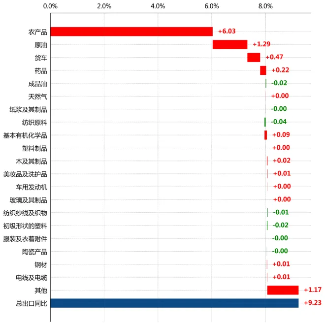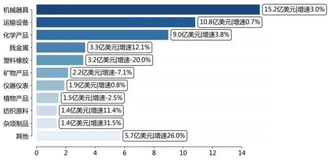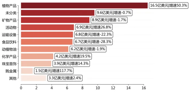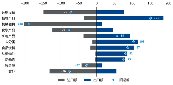 从商品大类看,"机械器具(84-85章)"贸易出现188.4亿美元逆差,"植物产品(06-14章)"实现150.6亿美元顺差。