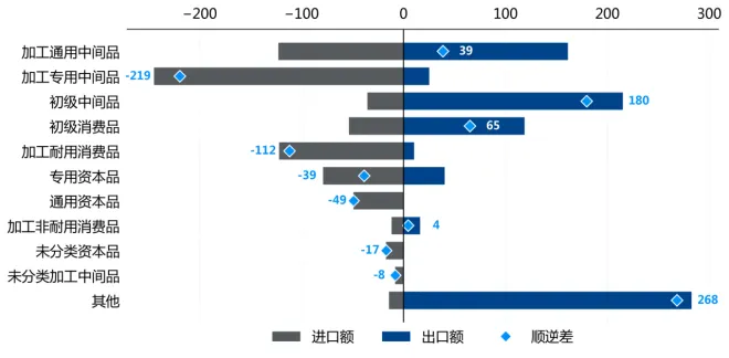 从价值链看,加工专用中间品贸易出现219.5亿美元逆差,初级中间品实现179.8亿美元顺差。