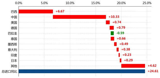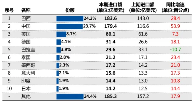 按拉动度分解,阿根廷自中国进口拉动整体增速10.3个百分点,自巴西进口拉动整体增速6.7个百分点,自德国进口拉动整体增速0.8个百分点。(注:此处拉动度为本年自该贸易伙伴进口金额的变动与上年同期进口总值的比值。)从份额来看,巴西、中国、美国占阿根廷总进口的比重分别为24.2%、23.7%、8.7%。