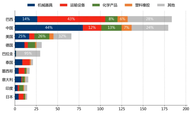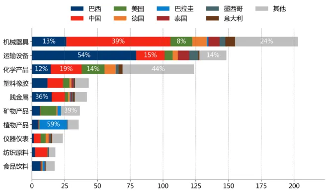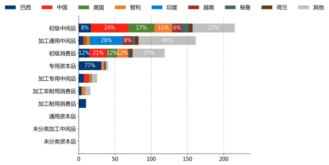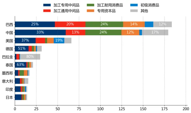 从价值链看,"加工专用中间品"占自泰国、日本、德国进口总值的比重为62.9%、54.8%、50.9%;"加工通用中间品"占自巴西、美国、意大利进口总值的比重为19.5%、16.7%、14.3%;"加工耐用消费品"占自墨西哥、巴西、中国进口总值的比重为29.8%、24.0%、23.5%。