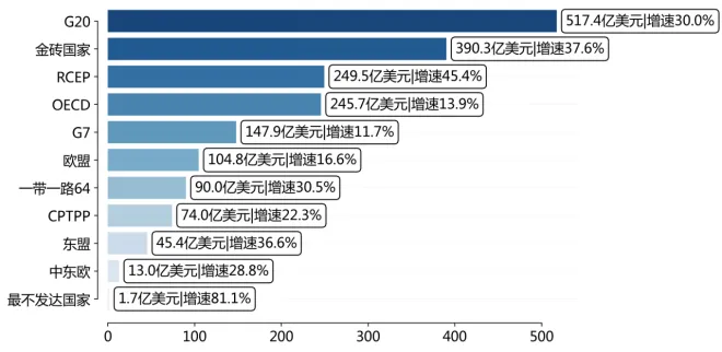 分主要经济组织/合作机制看,2025年1-12月,阿根廷进口前三名分别是G20、金砖国家、RCEP等,其中,G20规模第一,金额517.4亿美元,同比增长30.0%;最不发达国家增速最高,金额1.7亿美元,同比增长81.1%。