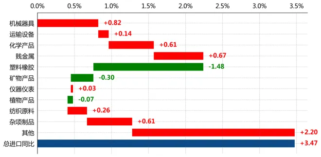 按拉动度分解,"塑料橡胶(39-40章)"进口拖累整体增速1.5个百分点,"机械器具(84-85章)"进口拉动整体增速0.8个百分点,"贱金属(72-83章)"进口拉动整体增速0.7个百分点。(注:此处拉动度为本年该商品大类进口金额的变动与上年同期进口总值的比值。)从份额来看,"机械器具(84-85章)"、"运输设备(86-89章)"、"化学产品(28-38章)"占阿根廷总进口的比重分别为26.8%、19.6%、16.3%。